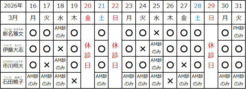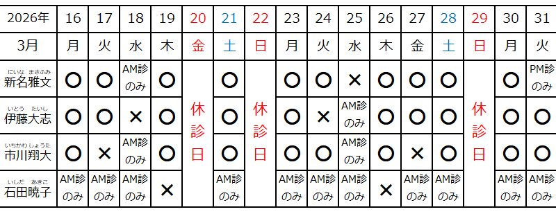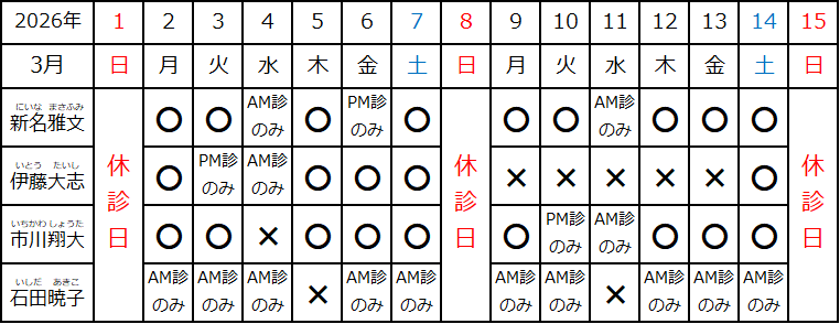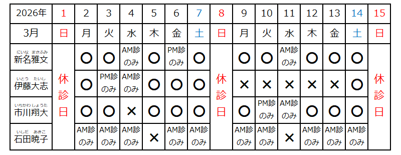 突発的な事情で止むを得ず欠勤する場合もございますので、詳しくは電話にてお問い合わせください。○ → AM・PM診どちらも出勤× → 欠勤