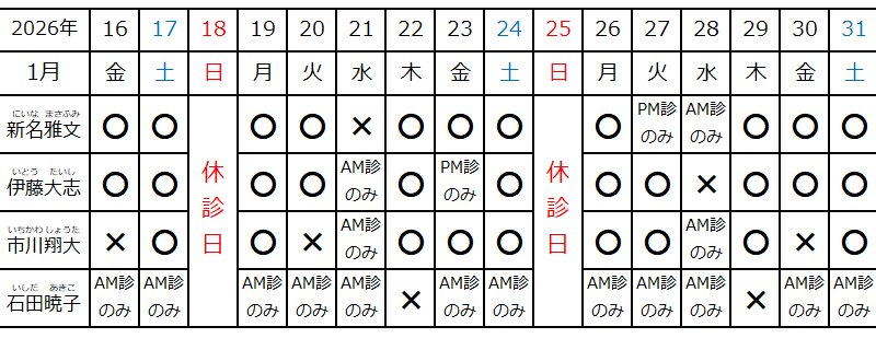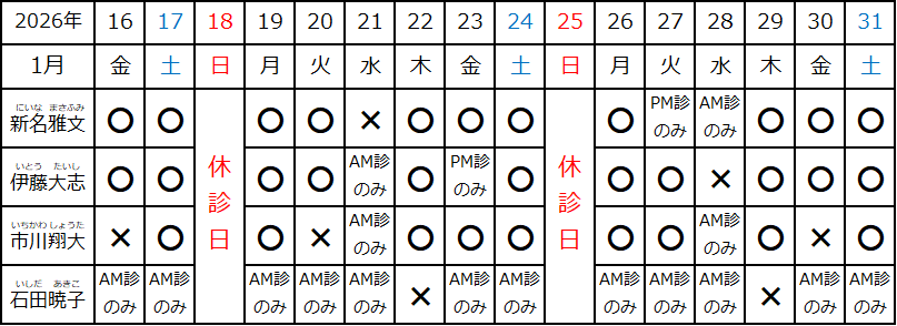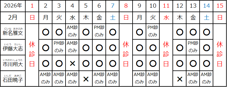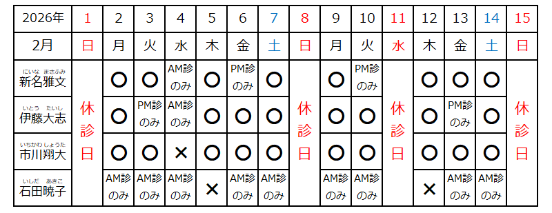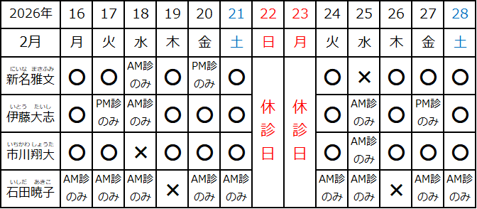 突発的な事情で止むを得ず欠勤する場合もございますので、詳しくは電話にてお問い合わせください。○ → AM・PM診どちらも出勤× → 欠勤